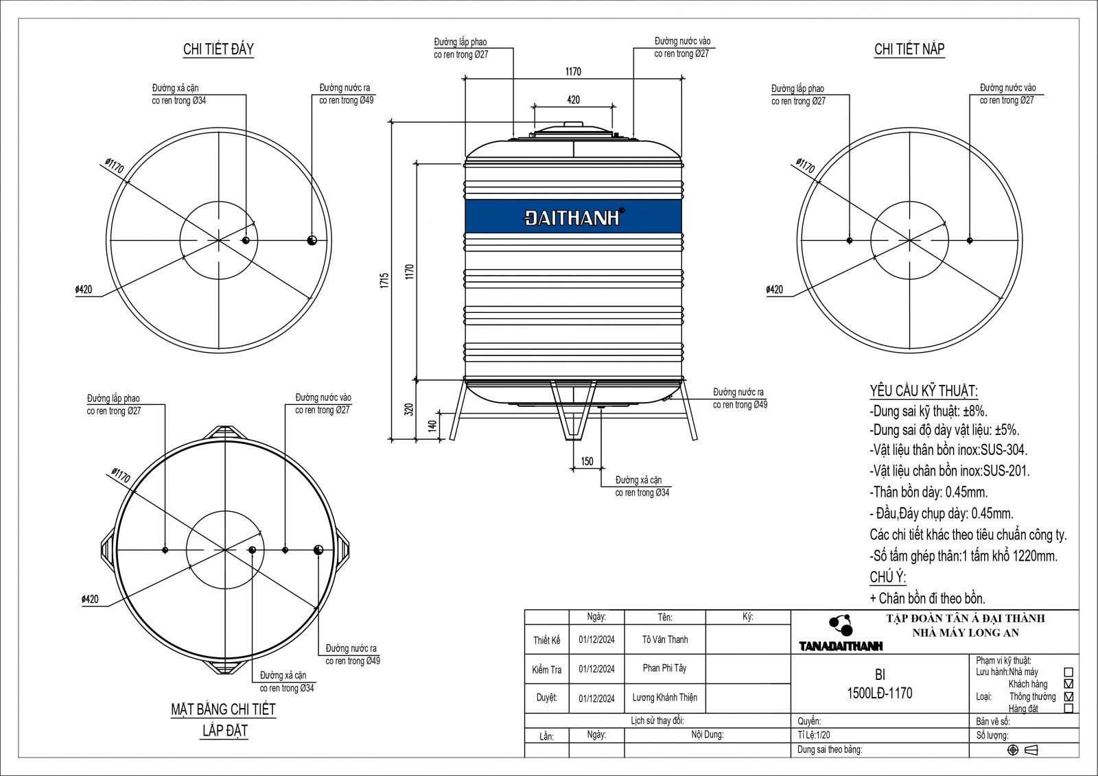 BỒN INOX ĐẠI THÀNH 1.500L ĐỨNG