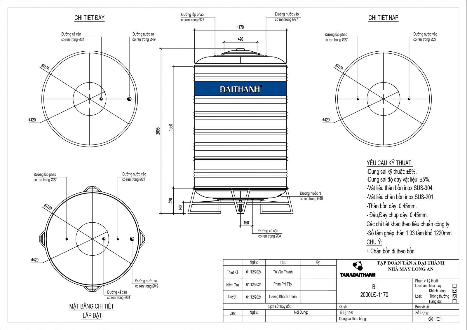 BỒN INOX ĐẠI THÀNH 2.000L ĐỨNG