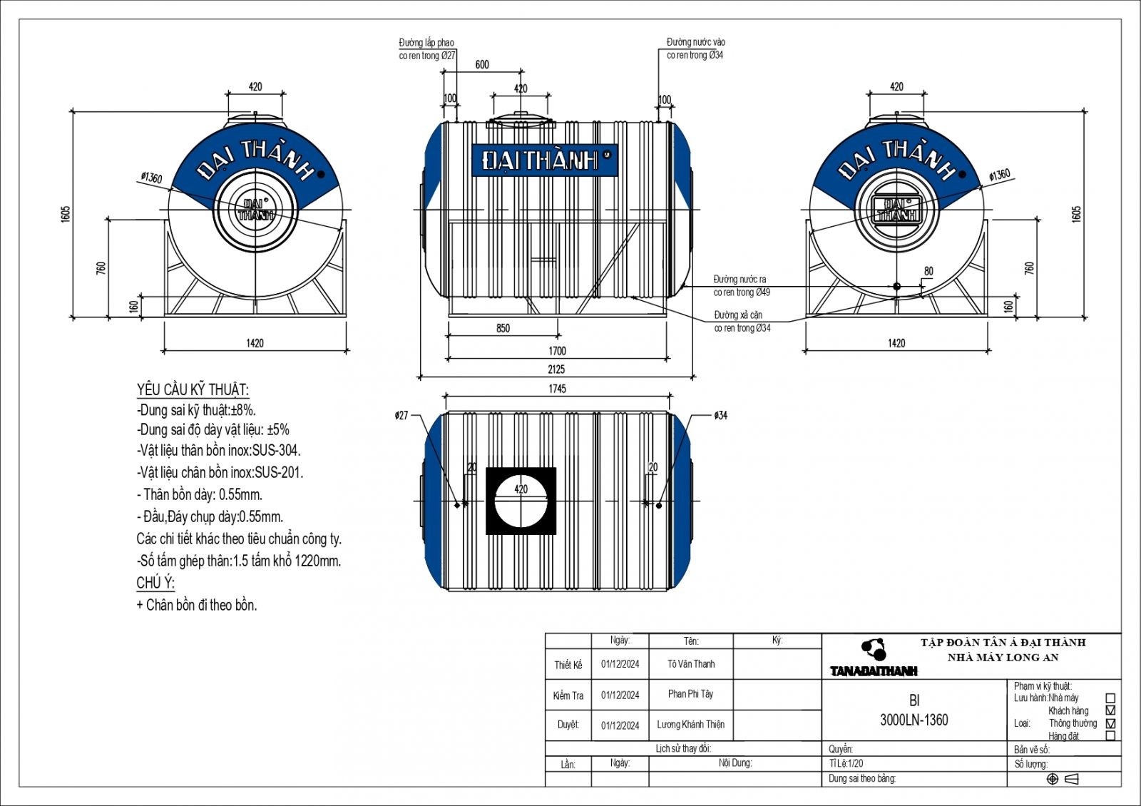 BỒN INOX ĐẠI THÀNH 3.000L NGANG