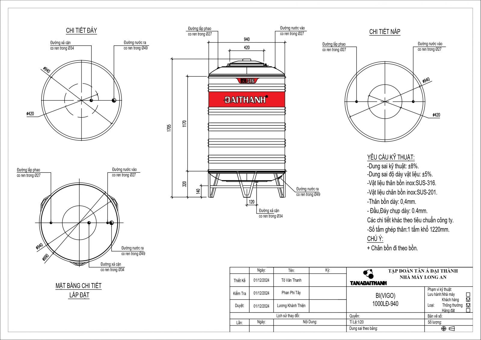 BỒN INOX 316 ĐẠI THÀNH 1.000L ĐỨNG