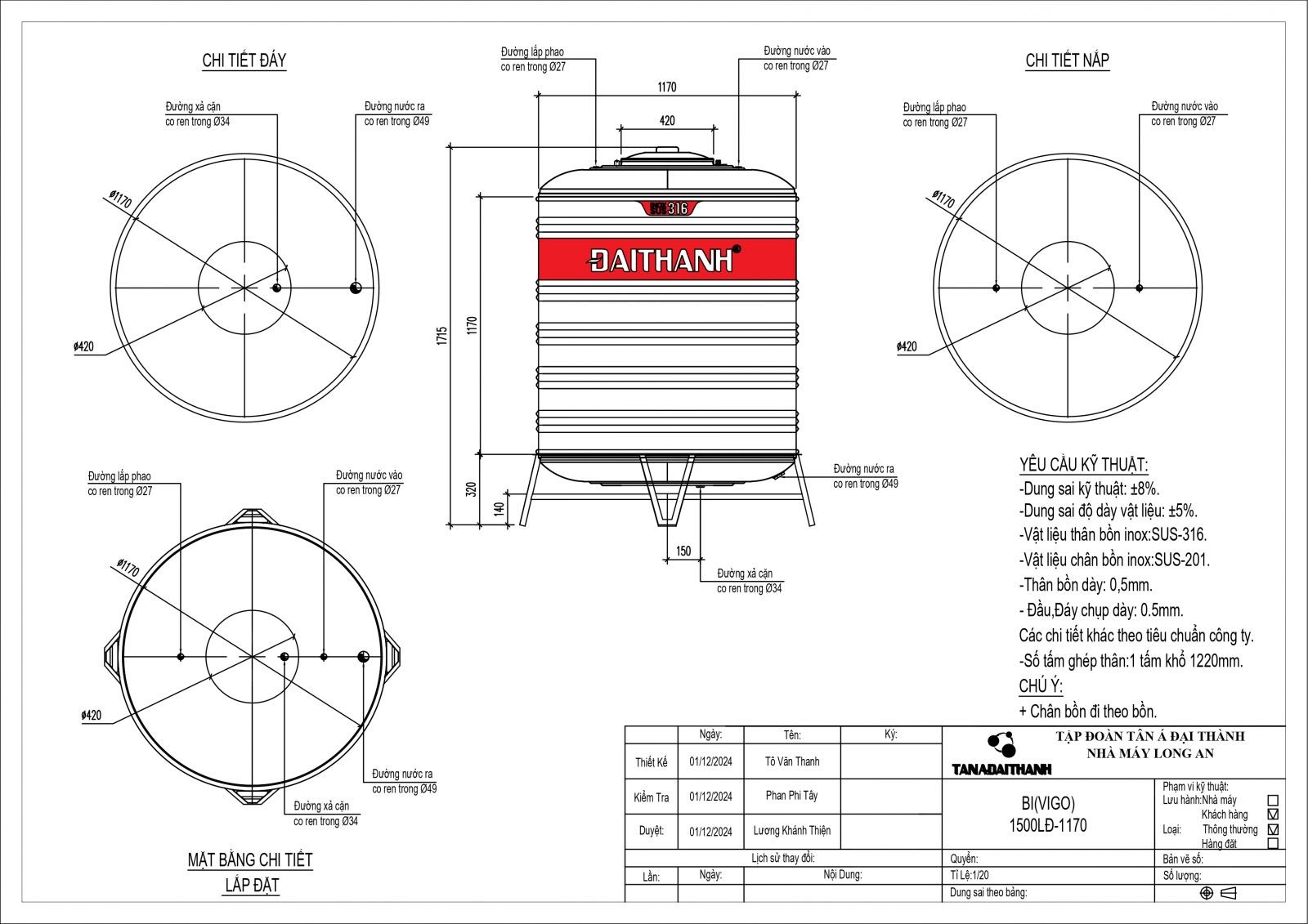 BỒN INOX 316 ĐẠI THÀNH 1.500L ĐỨNG