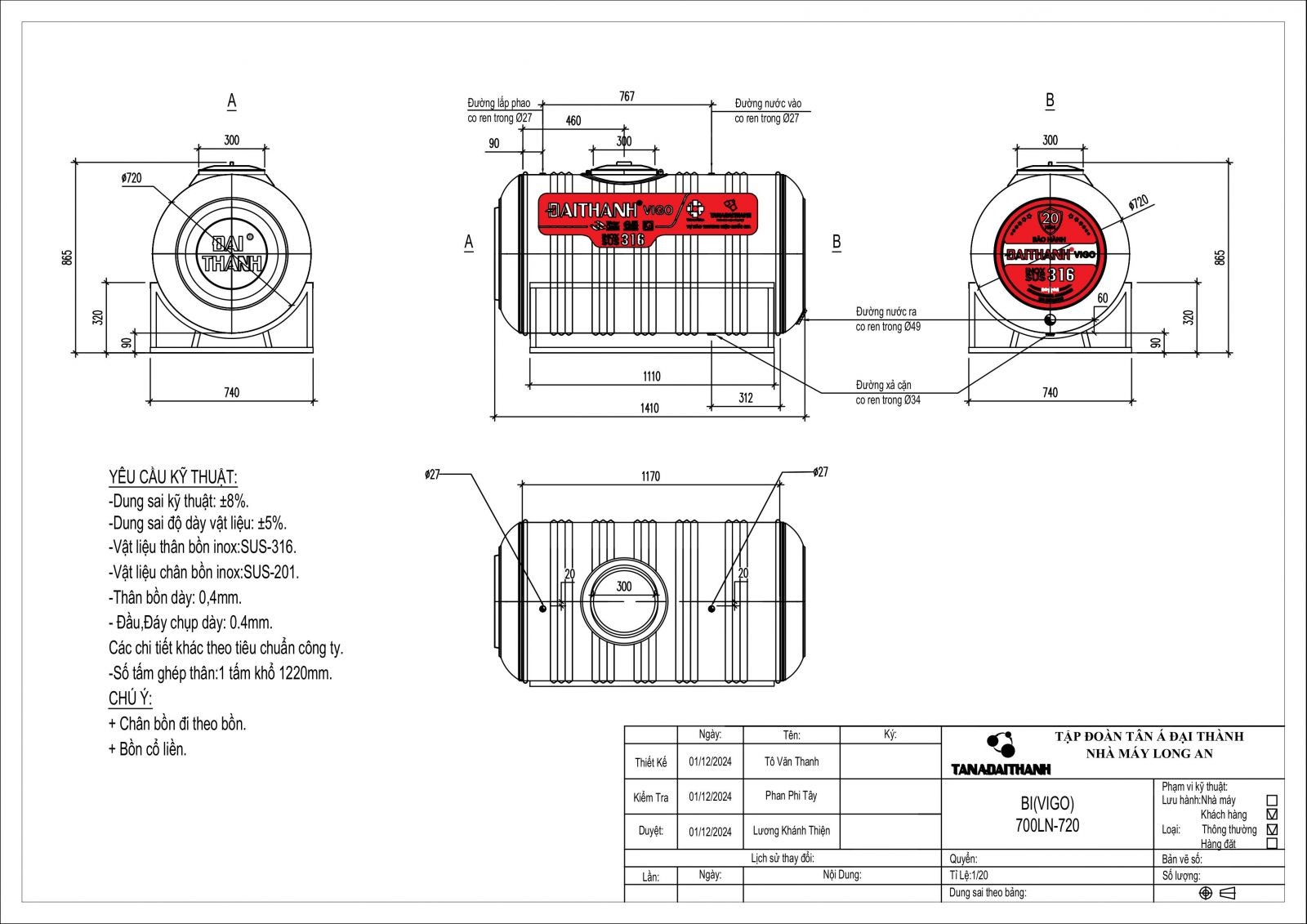 - Thời Gian Bảo Hành: Bồn Inox SUS 316 Đại Thành được bảo hành lên đến 20 năm
